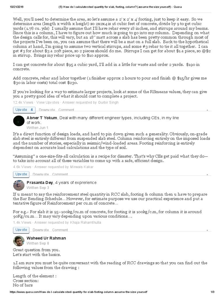 Set project zip code enter the zip code for the location where labor is hired and materials purchased. The calculator will automatically estimate the number of cubic yards of concrete that will be required. Enter the height (m), diameter (mm) and number of columns. We include items such as the size and height of the building to identify the best type of foundations, and accessibility issues that will have an immediate impact. Concrete footings cost $1.50 to $24 per linear foot, averaging $5 per linear foot.prices run $3 to $7 per square foot, depending on the project size and foundation type.an average house with dimensions measuring 150 linear feet ranges from $225 to $3,600.pier footers can be $75 to $150 per square foot, especially if you only need a few.
